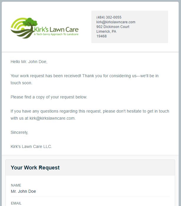 You will receive an email confirmation of your request and a Kirk's Lawn Care team member will be in contact with you shortly.