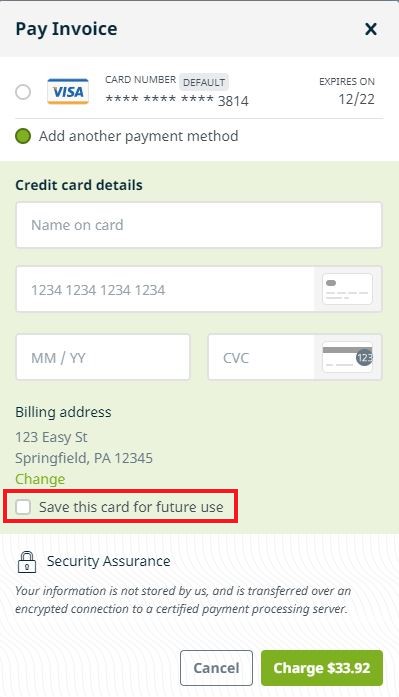 - Select a different saved card (if available) and process the payment by clicking the green "Charge $xx.xx" button.