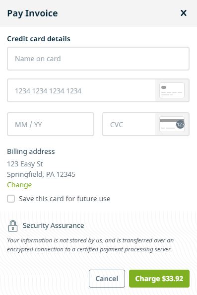 Carefully enter your card information and click the green "Charge $xx.xx" button.